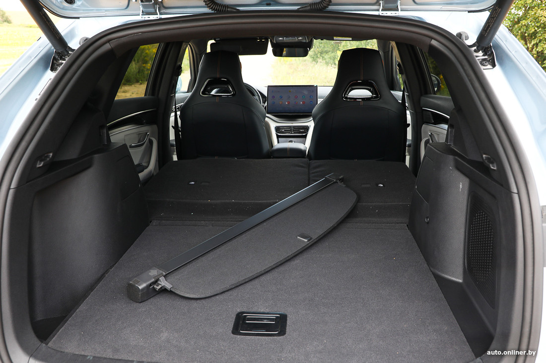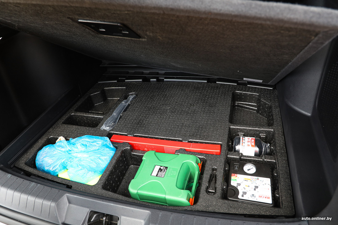 Заявленный объем багажника — 574 литра, но субъективно он воспринимается не таким емким. Порог практически отсутствует, диван складывается почти в ровный пол, увеличивая общую вместимость до 1477 литров, однако погрузочная высота велика. При этом в подполье вместо запаски находится органайзер с ремкомплектом для шин, а пластиковые боковины лишены карманов для мелочовки.