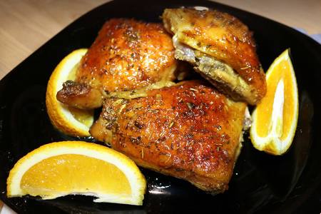 3. Духовку разогреть до 180 - 200 градусов. На курочку выложить апельсины и поставить выпекаться на 45-50 минут. Периодически поливать соусом.