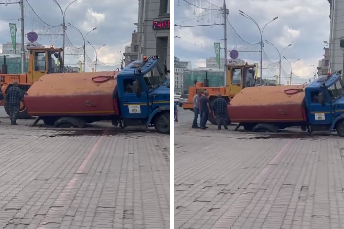 У мэрии Новосибирска начали ремонтировать тротуар — ранее под него провалилась поливальная машина