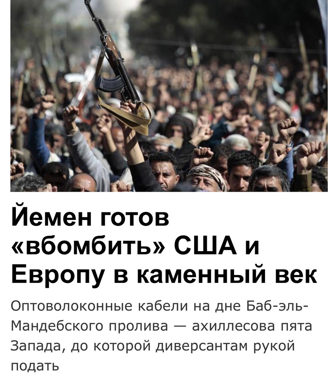 А оказывается, у них там недалеко от Йемена на дне кабели оптоволоконные лежат. И никому не хочется, чтобы их взорвали пьяные украинские диверсанты на лодке Андромеда.