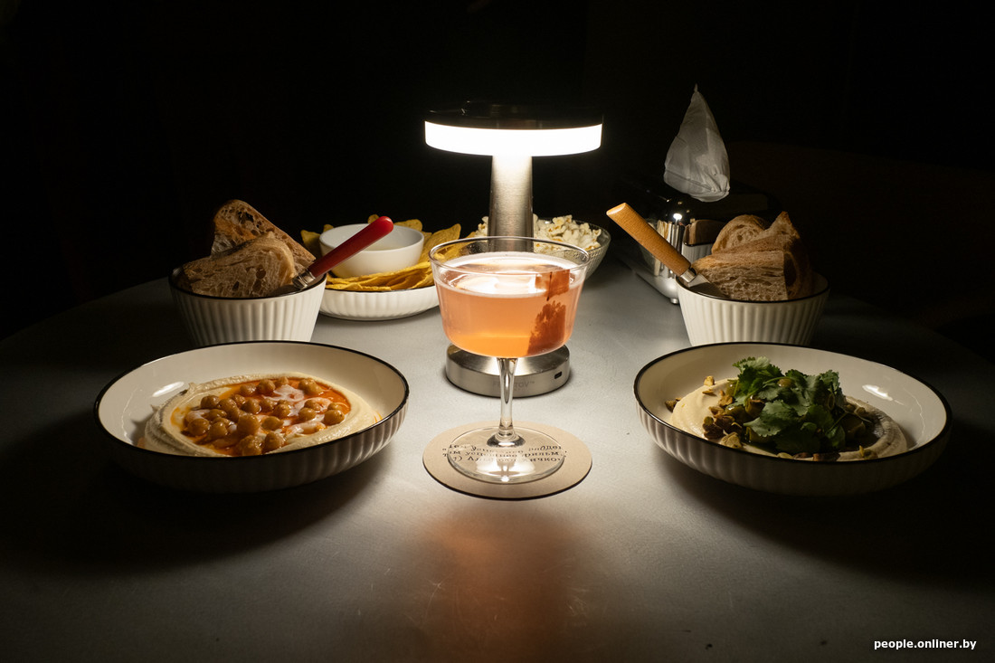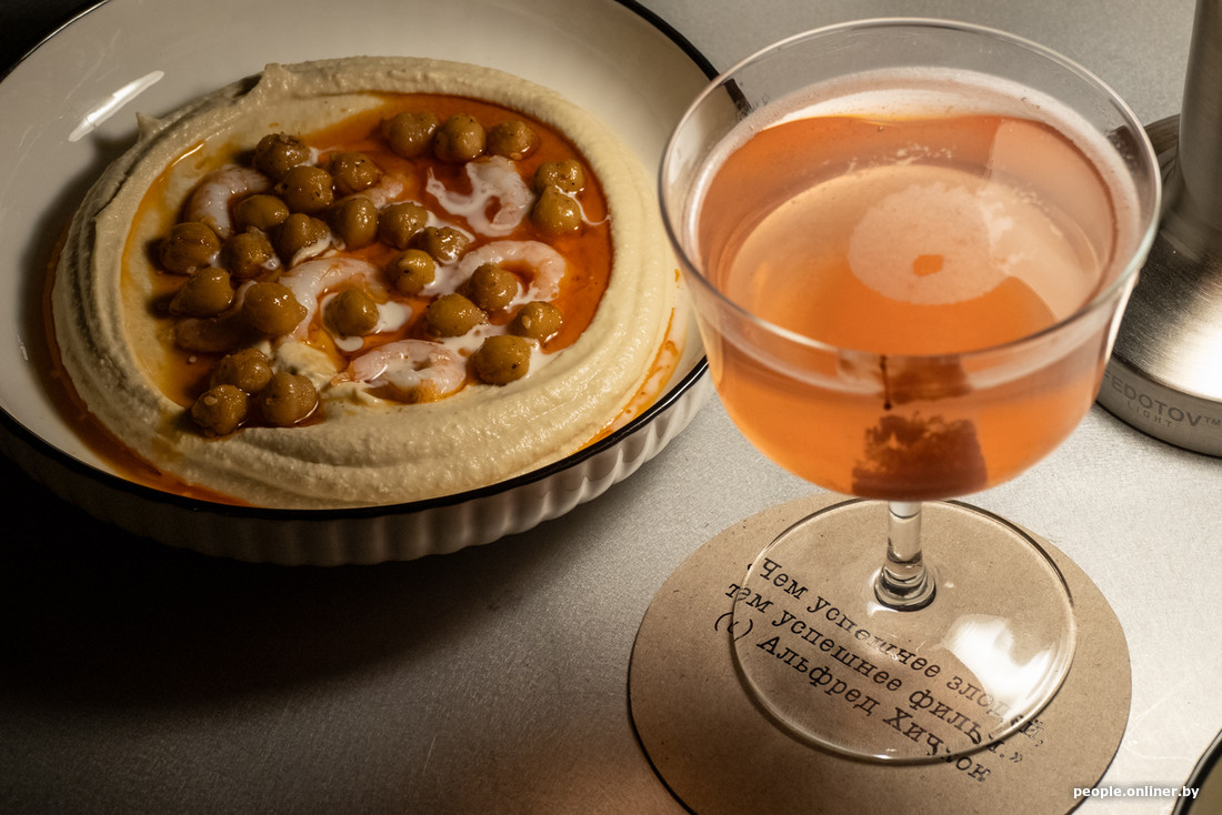 Еда в баре тоже есть, но пока в формате закусок. Хумус с разными дополнениями типа креветок, начос с соусом и даже попкорн — совсем как в модных кинотеатрах.