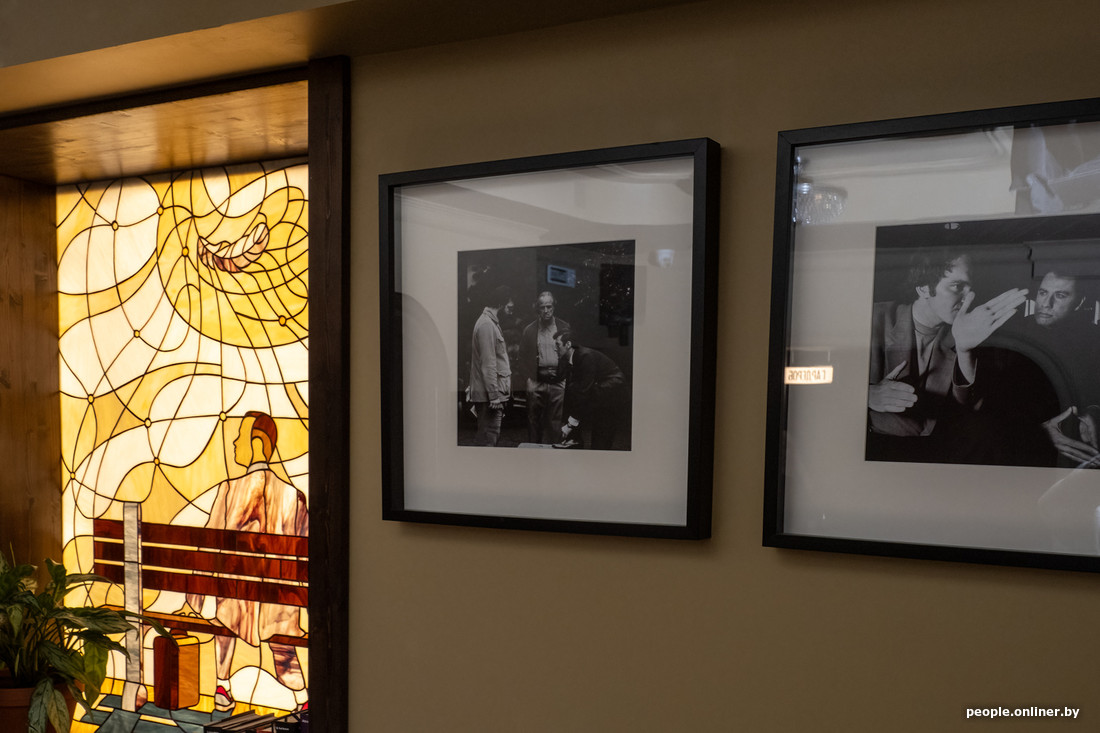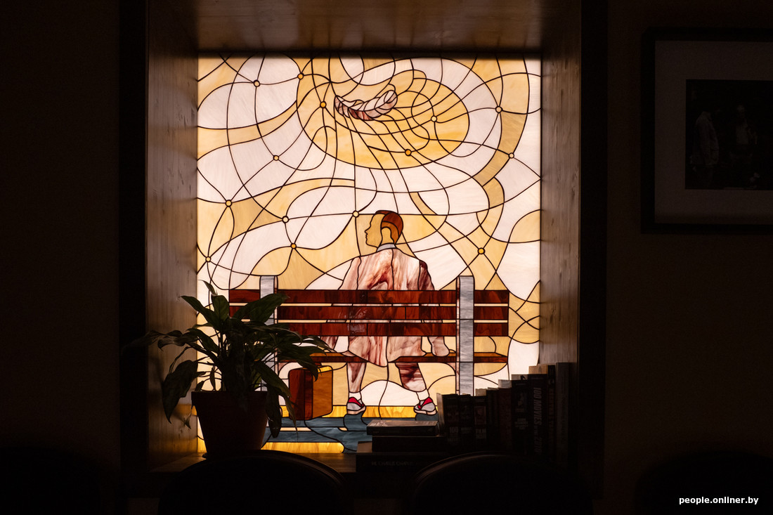 Для Гриши «Персонажи» — это уже не первый проект в сфере гостеприимства. Он приложил руку к созданию бара «Рок-н-ролльщик», который находится рядом. Минчанин шутит, что там его первая страсть — музыка, а здесь вторая — кино. Любимых фильмов у парня ожидаемо много. В топе самых пересматриваемых — «Форрест Гамп», а любимая цитата оттуда — «Жизнь как коробка шоколадных конфет: никогда не знаешь, какая начинка тебе попадется». Теперь понятно, почему витраж в баре посвящен именно этой картине.