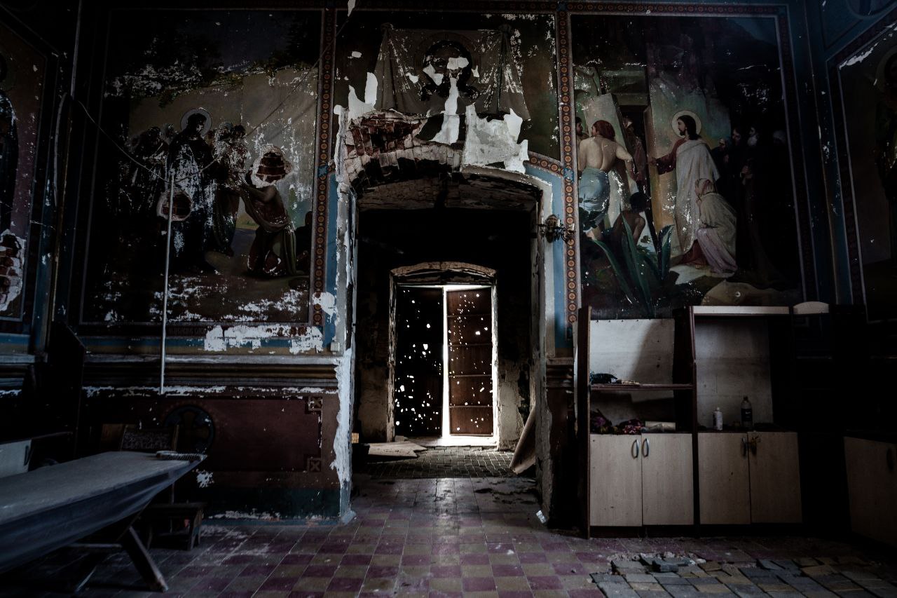 3. "Врата". Расстрелянные ворота в Свято-Николаевском храме в поселке Никольское и пробивающийся через дыры свет, символизирующий надежду на то, что после завершения войны может ждать что-то светлое и доброе.
