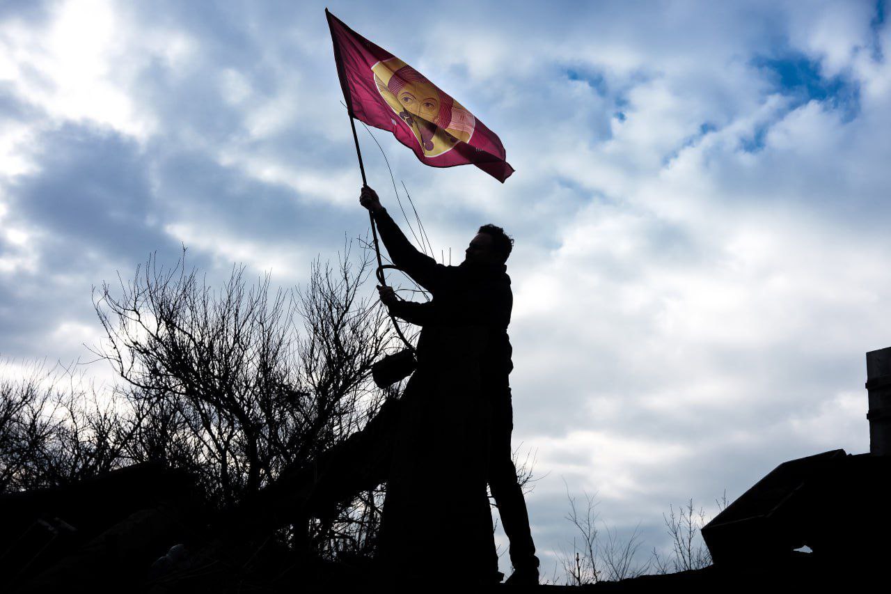 6. "Стяг с ликом Христа". Тема религии на войне обширная и о ней говорят много, в том числе и я. В качестве символа решил выбрать кадр с поднятием военкором Андреем Афанасьевым стяга с ликом Христа над бывшими позициями ополченцев ДНР под Авдеевкой.