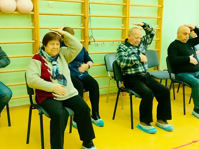 Инструктор по лечебной физкультуре, Олеся Лукина, провела занятие зарядкой для пациентов пожилого возраста. Участники занимались лечебной физкультурой, включающей элементы дыхательной гимнастики и нейрогимнастики для мозга.