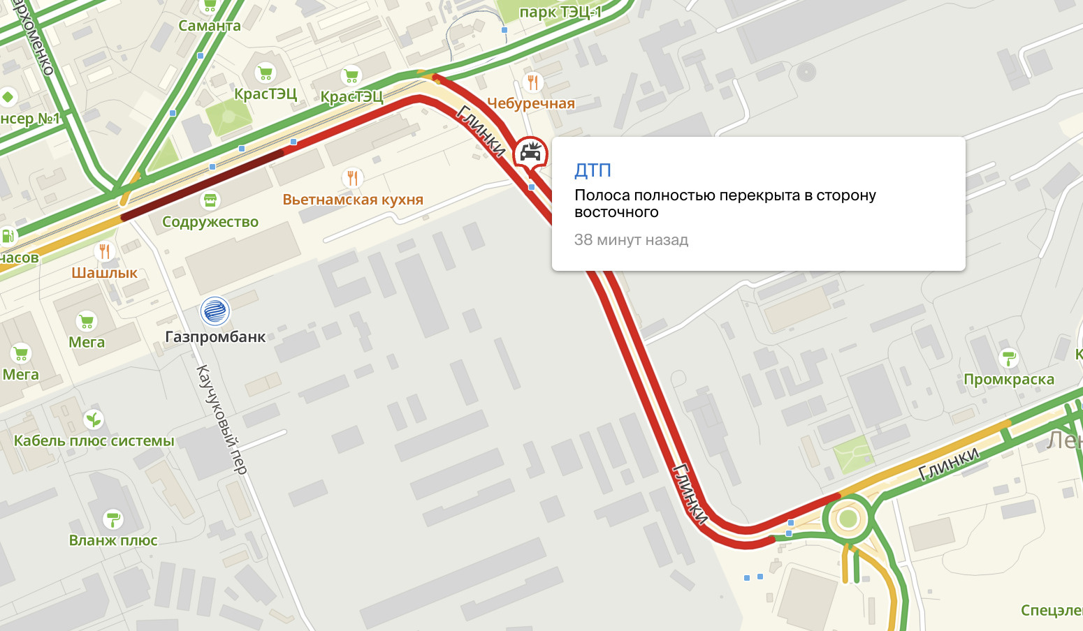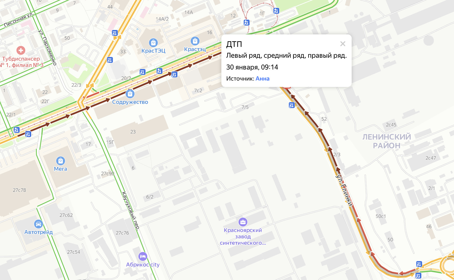 По информации авторов канала, четыре машины столкнулись и перекрыли проезжую часть, из-за чего в том районе собираются пробки. Сайт «2ГИС» сообщает о полном перекрытии полосы в восточную сторону. Отметка об аварии появилась на карте в 09:12 утром 30 января. Движение почти сильно затруднено на участке от остановки «ДК КрасТЭЦ» на Красноярском рабочем до остановки «Шинный перекресток» на Глинки.
