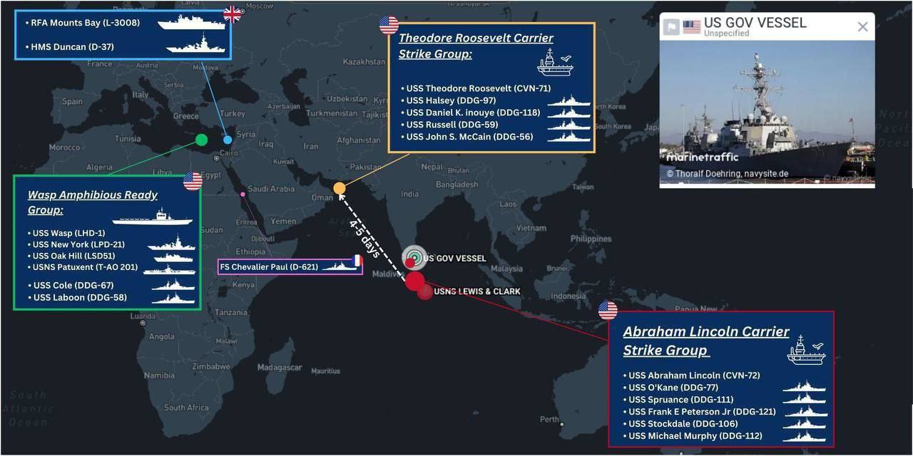 На его борту находятся истребители F-35C и F/A-18 Block III. В ударную группу входит также атомная подводная лодка.