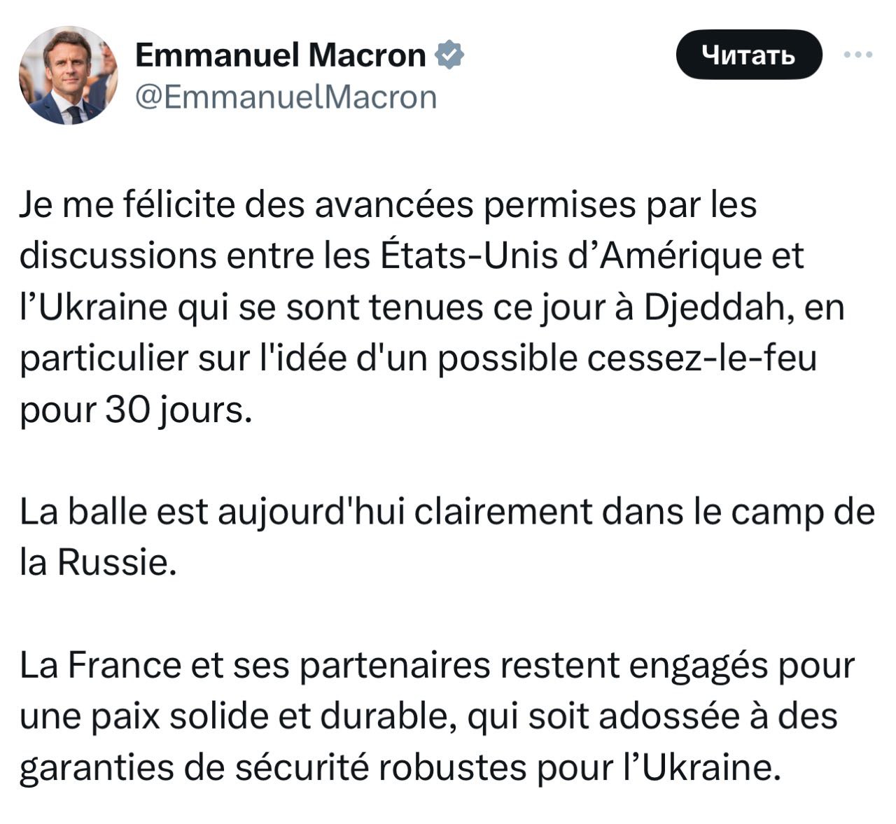 «Франция и её партнёры привержены прочному и долгосрочному миру, подкрепленному надёжными гарантиями безопасности для Украины».