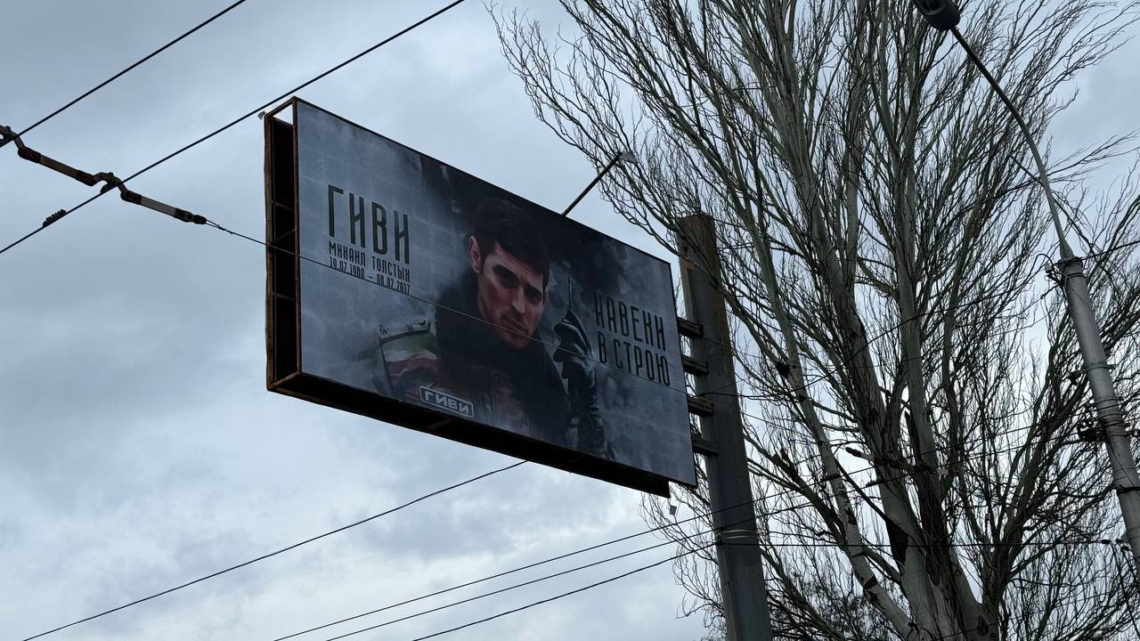 В Донецке появились билборды ко дню памяти Героя ДНР «Гиви». Сегодня 7 лет, как он погиб. Портрет нарисовали донецкие художники.