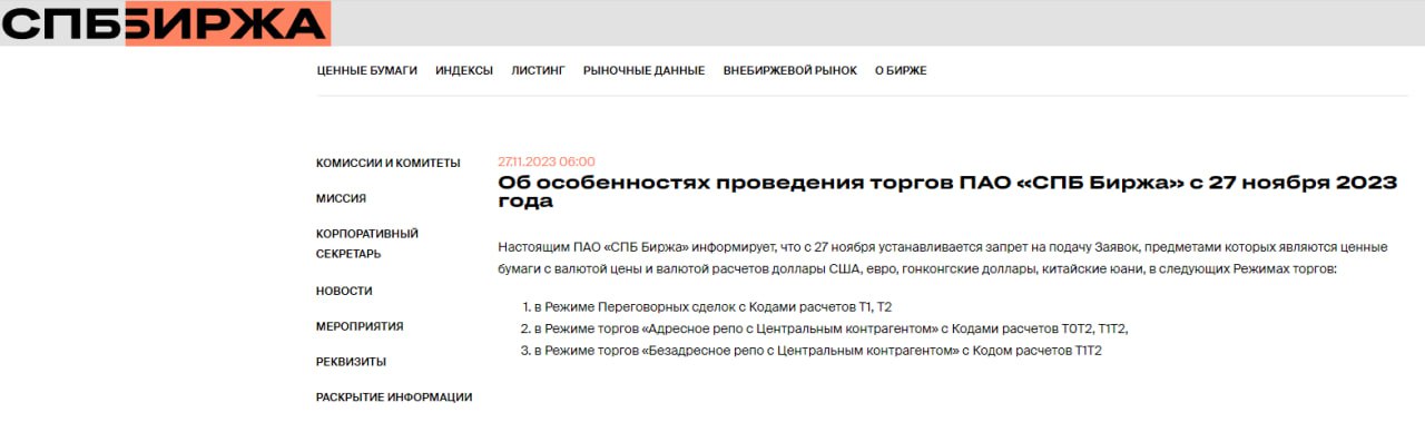 СПБ-биржа установила запрет на подачу заявок по ценным бумагам в долларах США, евро, гонконгских долларах и юанях с 27 ноября.