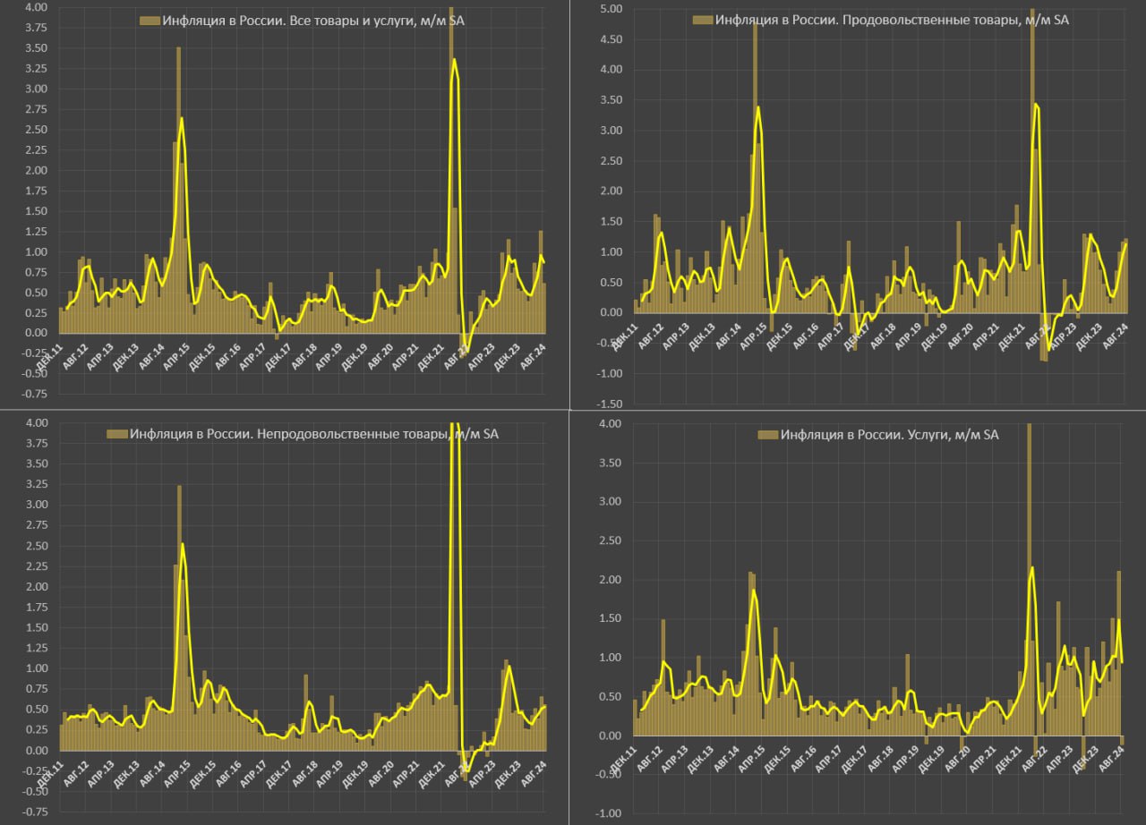 Инфляция в августе составила 0.62% м/м SA по методологии ЦБ, что вдвое ниже июльского показателя (1.26% м/м) и вполне соответствует среднему значению за 8м24 (0.68%).