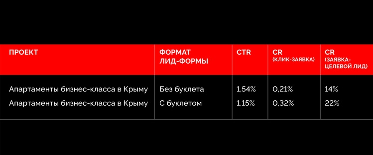 Эту же гипотезу в дальнейшем мы протестировали при продвижении апартаментов бизнес-класса в Крыму. Исходная проблема здесь была аналогичной: низкая конверсия из клика по форме в заявку (0,21%) и из заявки в лид (14%). В результате стоимость целевого лида сильно превышала KPI клиента.