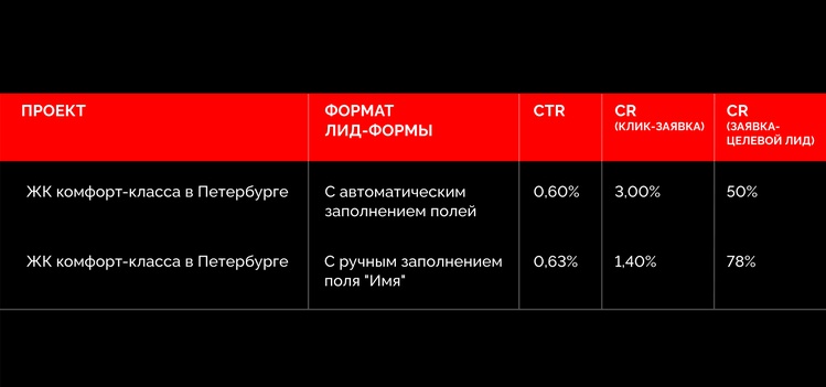 Одна из сложностей в работе с лид-формами — это возможный рост объема нецелевого трафика, из-за которого снижается конверсия из заявки в целевой лид. Мы тестируем различные методы решения проблемы. Например, в марте 2024 года для продвижения жилого комплекса комфорт-класса в Петербурге задействовали лид-форму с ручным заполнением поля «Имя» при отправке заявки.