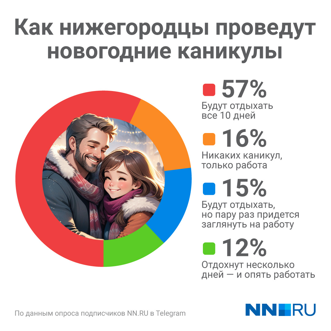 Недавно мы проводили опрос в нашем Telegram-канале, который показал, что большинство нижегородцев — 57% — собираются отдыхать все десять праздничных дней. Всего в опросе приняли участие порядка 2000 человек.