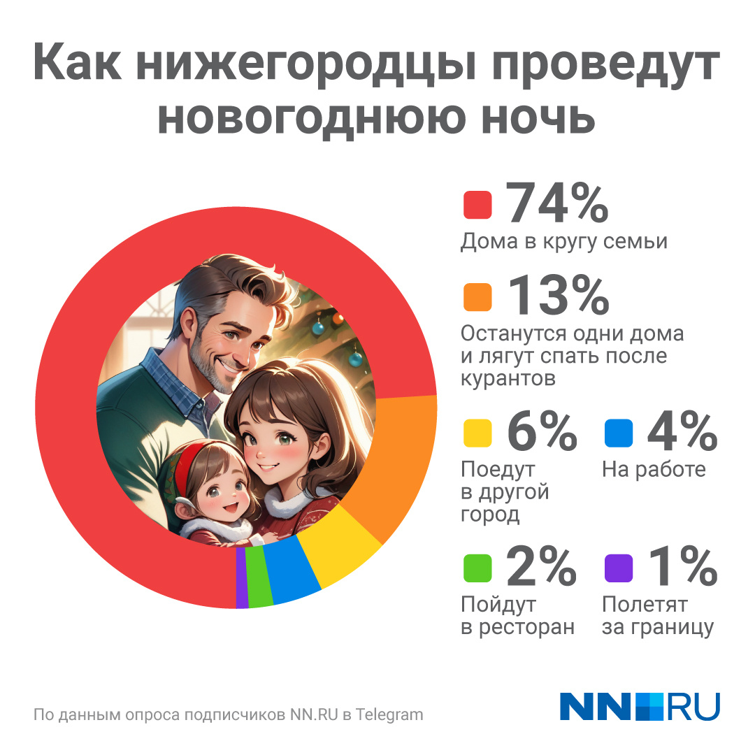 Но, видимо, праздничное настроение захватило не всех. Целых 13% нижегородцев, проголосовавших в нашем опросе, решили встретить праздник дома в одиночестве. А некоторые, наоборот, активно пакуют чемоданы, чтобы отправиться в новогоднее путешествие: 6% наших подписчиков поедут на праздник в другой город, 1% решил встречать 2024 год за границей. Еще 2% выбрали отмечать Новый год в ресторане.