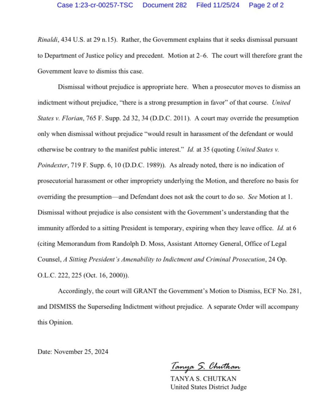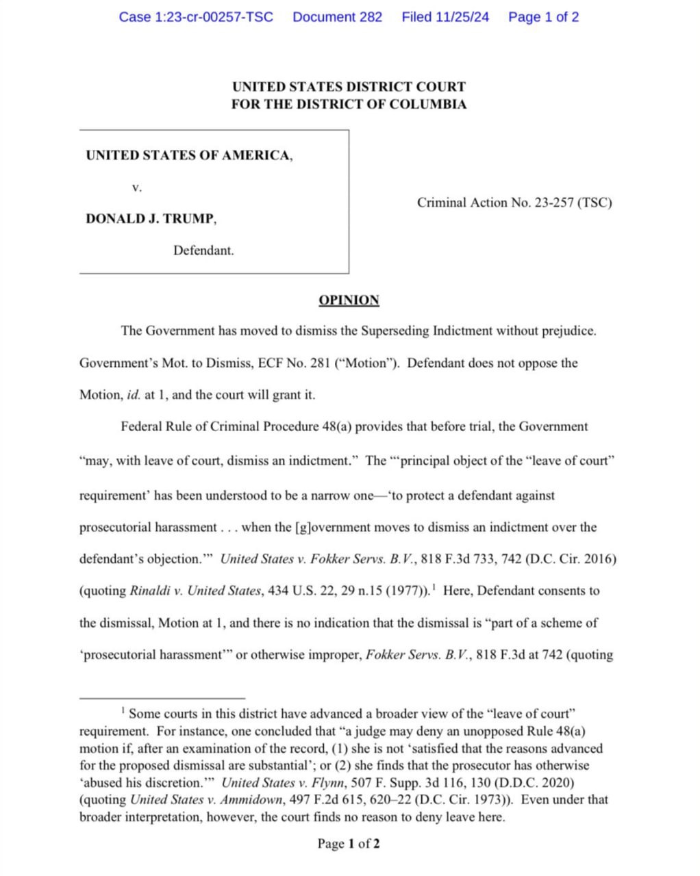 Судья федерального суда в округе Колумбия Таня Чуткан согласилась с доводами прокуратуры и прекратила уголовное дело против Дональда Трампа.