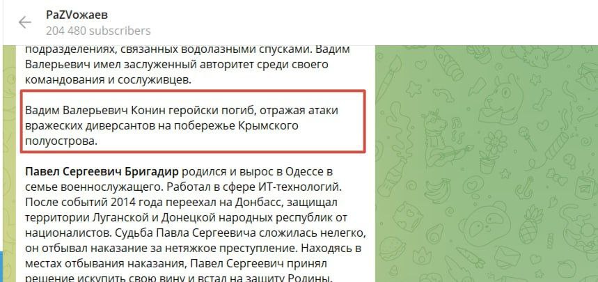 Губернатор Севастополя Михаил Развожаев в своём телеграм-канале сообщил о смерти старшего матроса, сапера-разведчика Вадима Конина. Как говорится в официальном сообщении, Вадим Конин «геройски погиб, отражая атаки вражеских диверсантов на побережье Крымского полуострова».