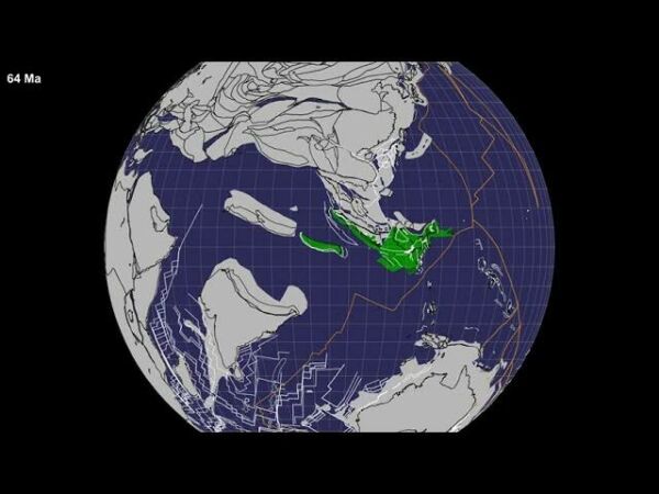 На этом скриншоте из поясняющего ролика видно, как части Арголенда (выделены зеленым) отдрейфовали от Австралии и направляются на север. Эти зеленые «детали» остановятся в районе нынешних Индонезии и Мьянмы.