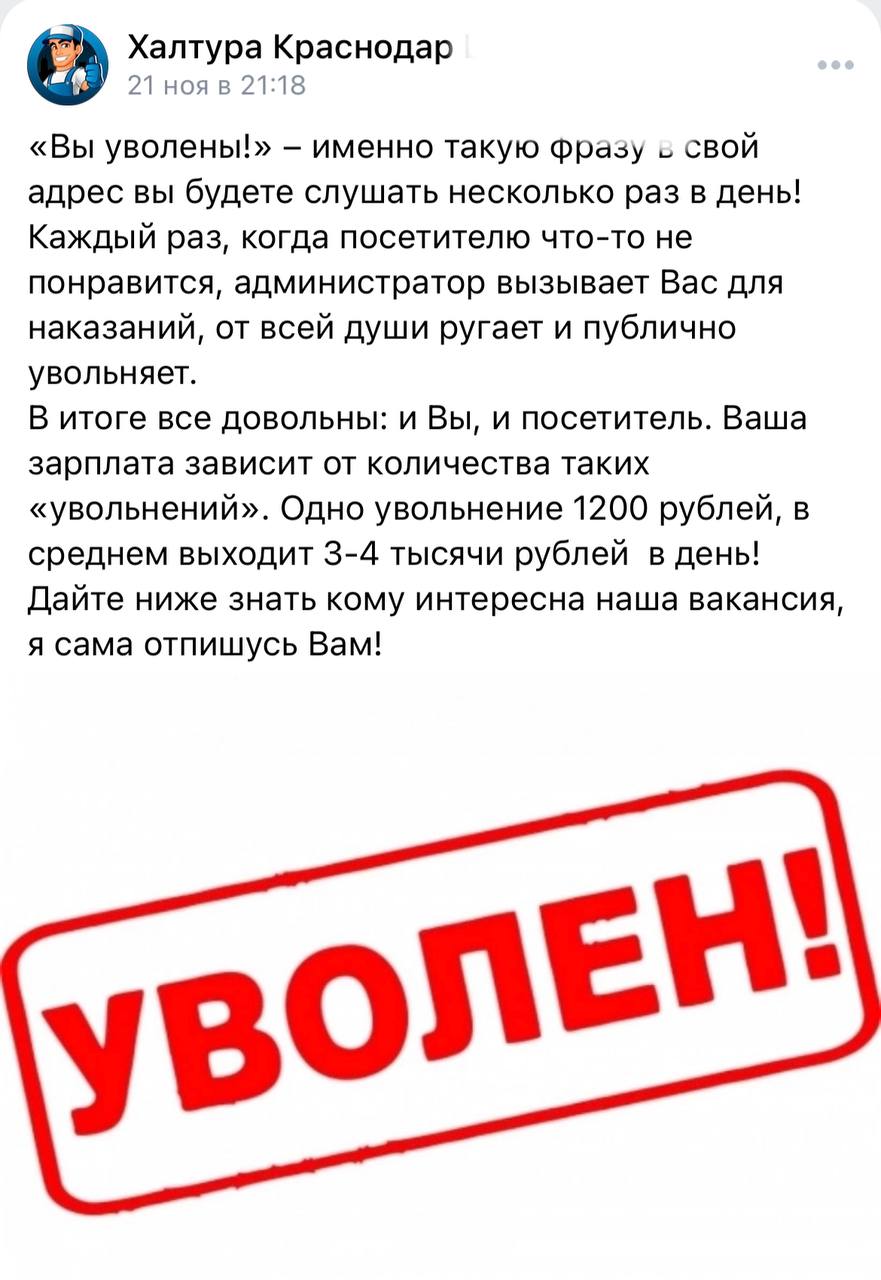 Работа мечты найдена в Краснодаре: в вакансии ищут человека, которого будут прилюдно увольнять.