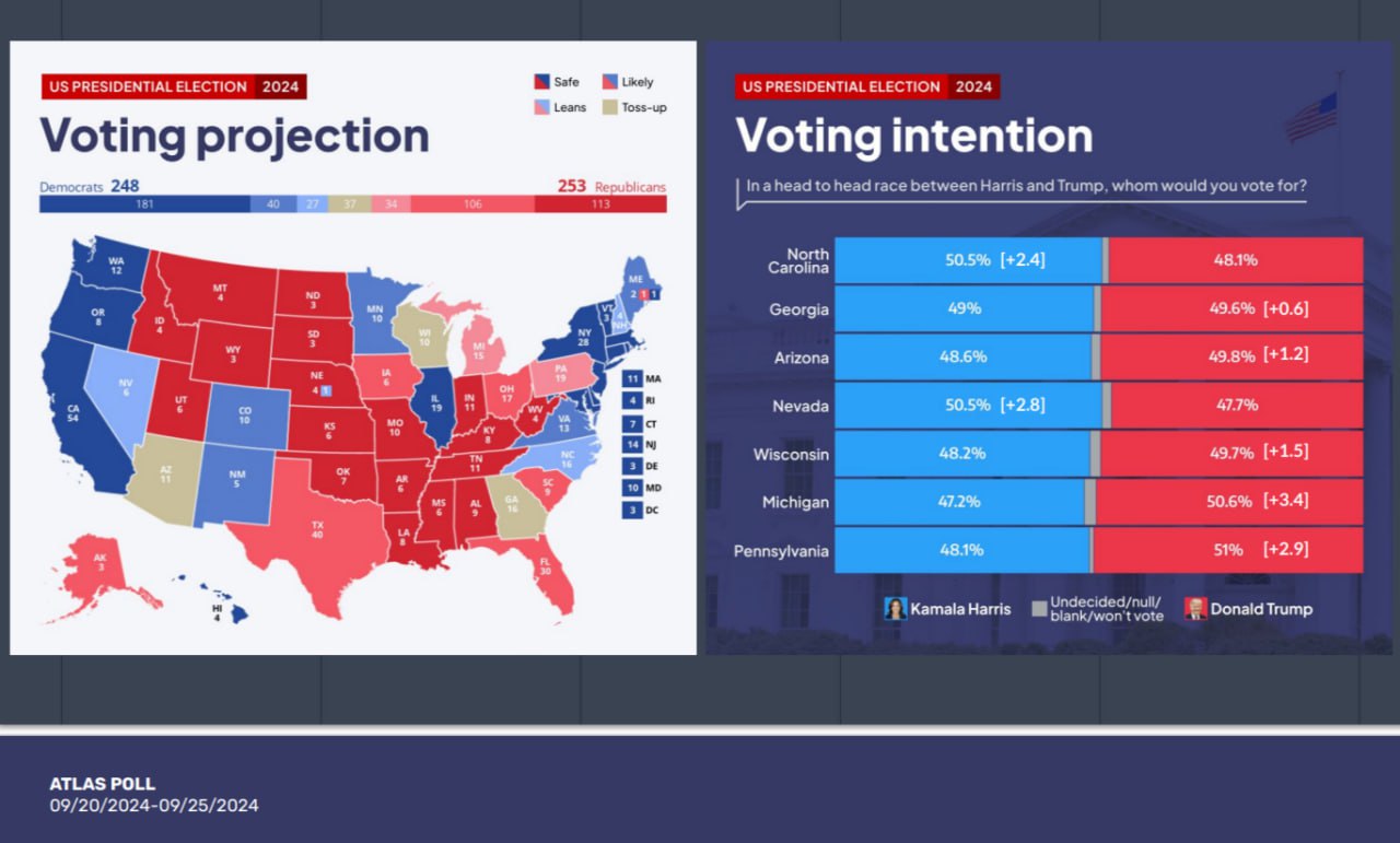 Весьма интересную картину настроений в колеблющихся штатах, где будет определяться результат ноябрьских выборов президента США, показывает анализ агентства AtlasIntel.