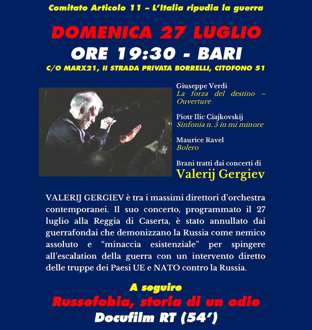 Учитывая очень сжатые сроки, я был бы счастлив, если бы нашел хотя бы одну ассоциацию, чтобы объявить День против русофобии хотя бы в одном итальянском городе. Но позорная отмена концерта Гергиева вызвала такой отклик, что к нашей акции присоединились целых шесть ассоциаций в шести городах - Бари, Витербо, Прадамано, Серрастретте, Конфленти и Сегроминьо-ин-Монте. Среди главных событий акции - показ документального фильма RT "Русофобия: история ненависти". А сразу после финальных титров идут публичные дискуссии о растущих в Италии репрессиях против инакомыслящих.