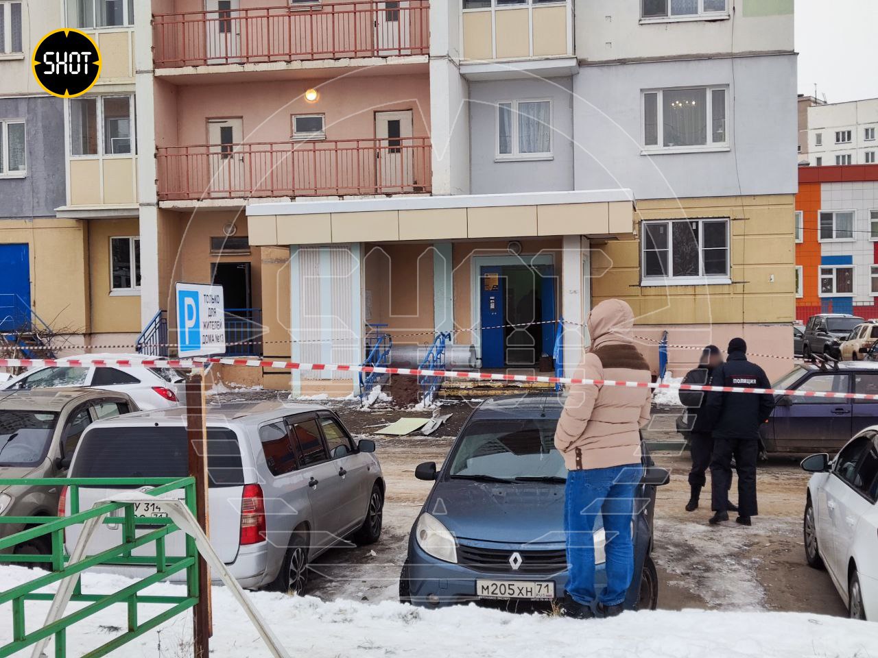 Обстановка возле дома на улице Хворостухина в Туле, куда врезался украинский беспилотник — территория оцеплена, работают оперативные службы. 60 жильцов, среди них 12 детей, эвакуировали из подъезда, по информации SHOT