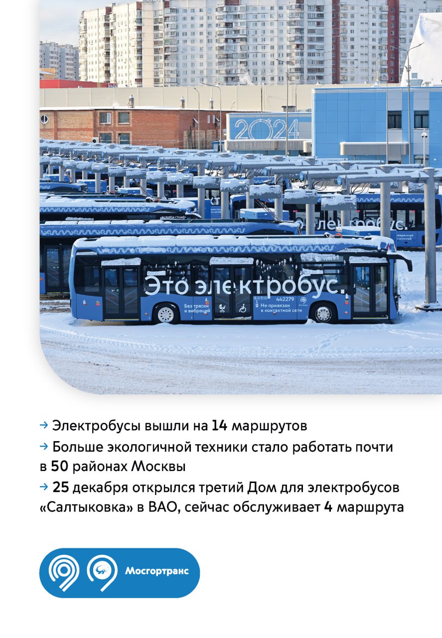 На 14 маршрутов вышли современные электробусы, экологичный транспорт поехал почти в 50 районах. Поездки до более 70 станций метро и МЦД, а также важных городских объектов и точек притяжения стали еще комфортнее, а негативное влияние на окружающую среду снизилось.