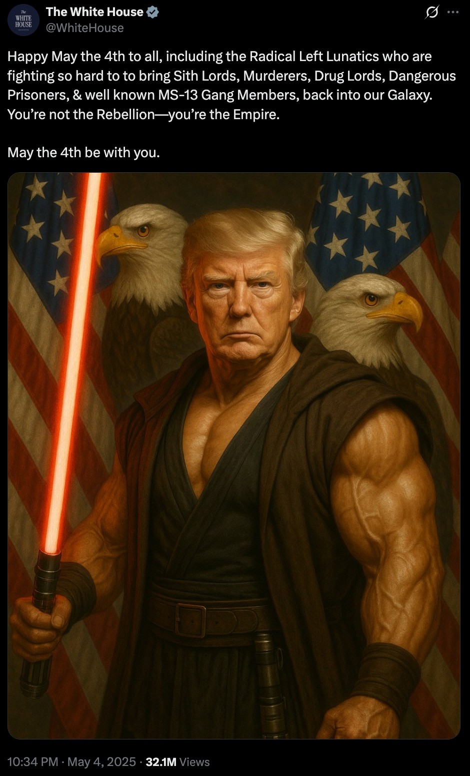 Белый дом опубликовал ИИ-картинку с Трампом в образе ситха на стероидах, при этом обвинил "радикально левых" в том, что это они – империя