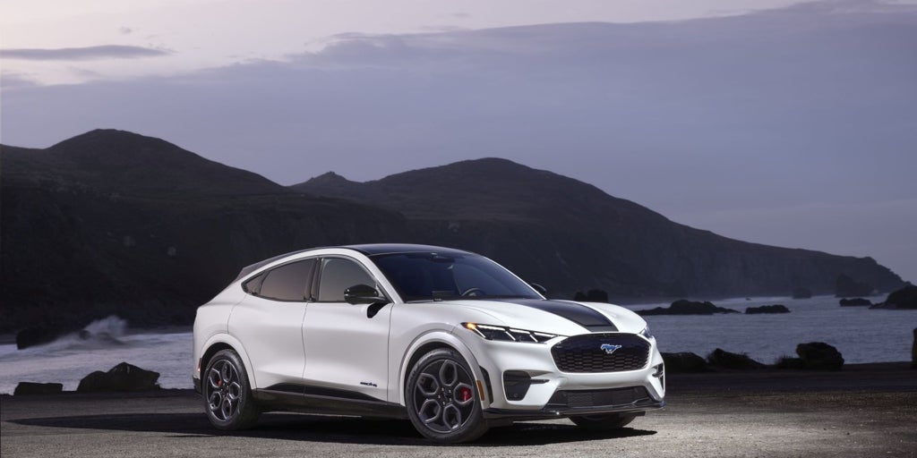 El Mustang Mach-E GT California Special incorpora varios elementos de diseño exclusivos como las llantas de 20 pulgadas en un llamativo color gris carbonizado con el logotipo GT/CS grabado; El emblema del pony en la parrilla lleva un marco anodizado oscuro, y además luce un gráfico especial en el capó con la marca de palabra «California Special» y líneas de «puesta de sol» radiantes en capas de gris, negro y un acento azul que representa el océano.