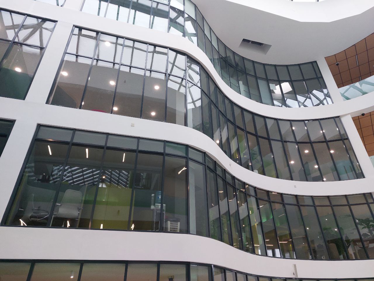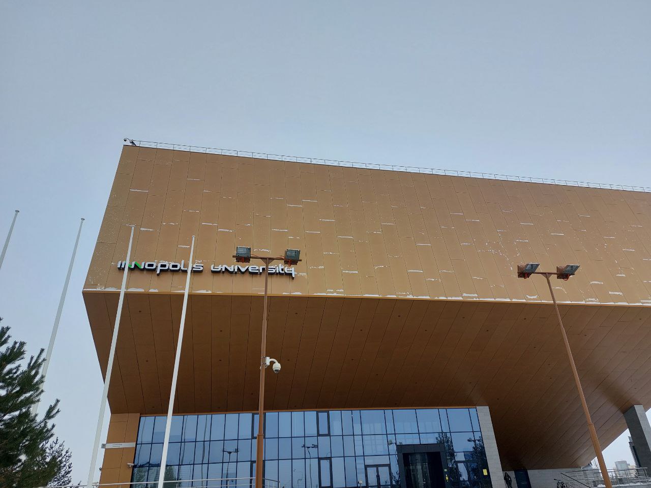 Интересное наблюдение от «иннополисян», так называют себя горожане: в городе нет здания выше 13 этажей. Самым высоким является один из корпусов общежития университета. Жители признаются, что не хотят иметь в городе зданий ещё, чтобы осталась возможность разглядывать небо и получать больше света. Попав в город на закате, мы поняли, чем обосновано это желание: город равномерно поглощается ночной мглой, не цепляющейся за шпили высоток.Во всех сооружениях очень много окон или светоотражающих элементов. Благодаря этому здания внутри очень светлые. Все архитектурно стильные и продуманные. Например, два корпуса детского сада выполнены в виде разделенных шестеренок, а спорткомплекс напоминает массажный ролик для йоги. Из здания университета также выступают металлические основания. С первого взгляда это может показаться простым визуальным решением, но практическая цель состоит в защите от ветров и солнца.