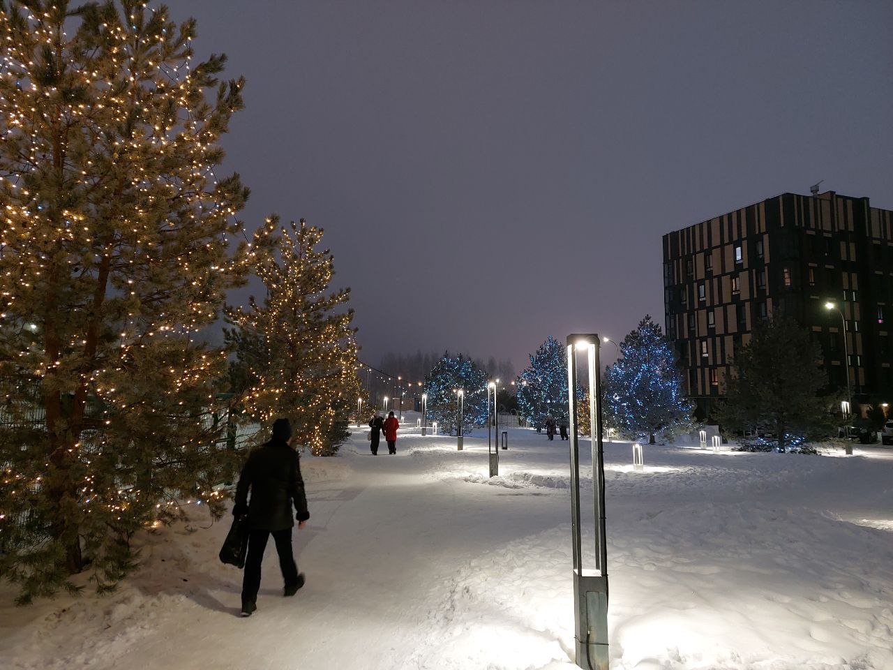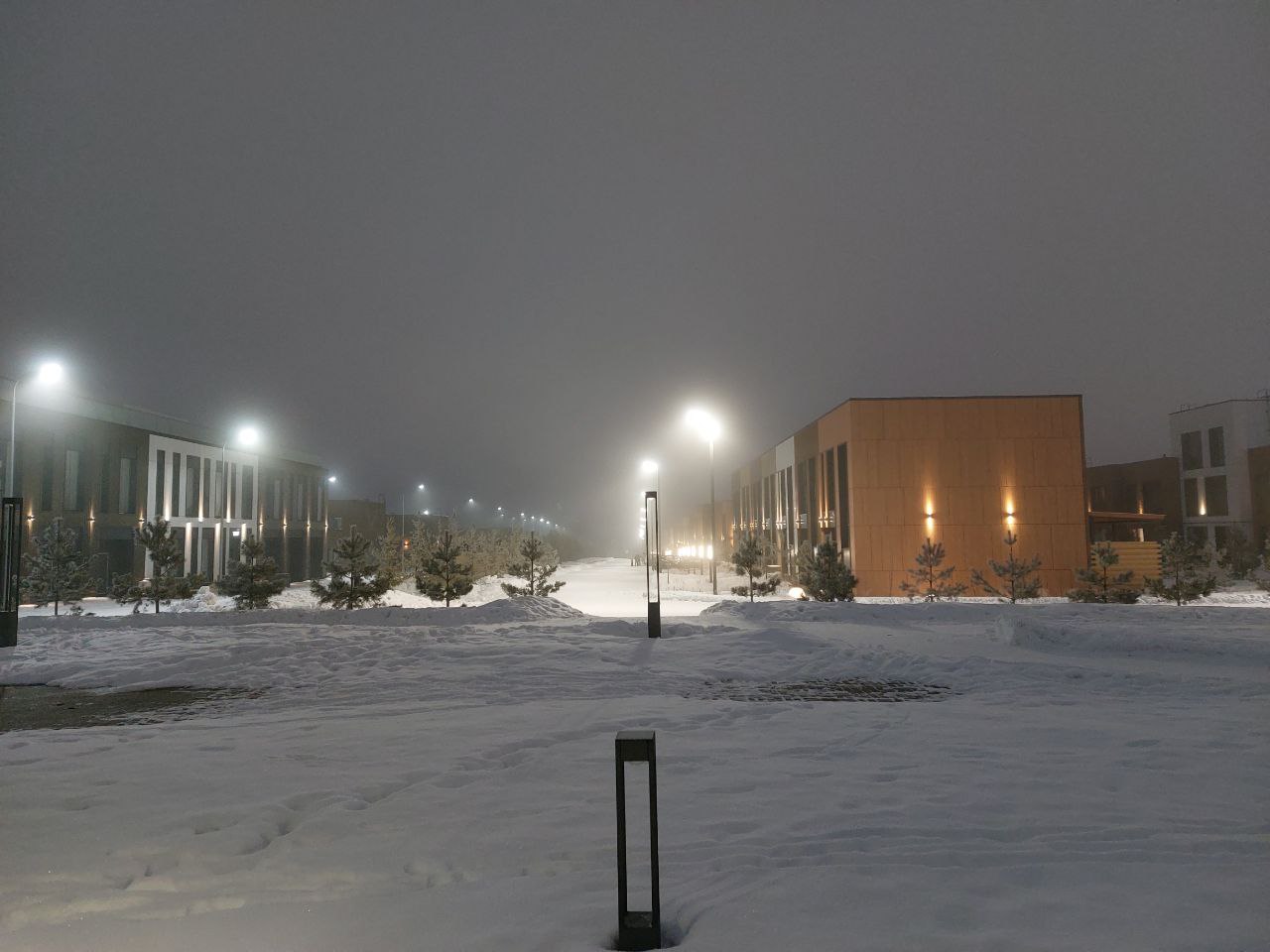 Когда настало время уезжать домой, мы прошлись через весь город к остановке. К этому времени на Иннополис опустился туман, а иллюминация приглушенно сияла во мраке. И несмотря на уют, который создают подсветки и тишину, которая неотделима от города, в какой-то момент накрывает ощущение поглощающей пустоты. Огни уходили вдаль, и город еще сильнее отрезался от внешнего мира.