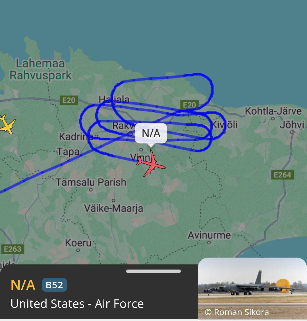 ⚡️Стратегический бомбардировщик B-52H Stratofortress ВВС США, носитель ядерного оружия, в сопровождении сразу нескольких истребителей F-35A Lightning II совершил полёт в воздушном пространстве Эстонии в 50 км от российской границы.