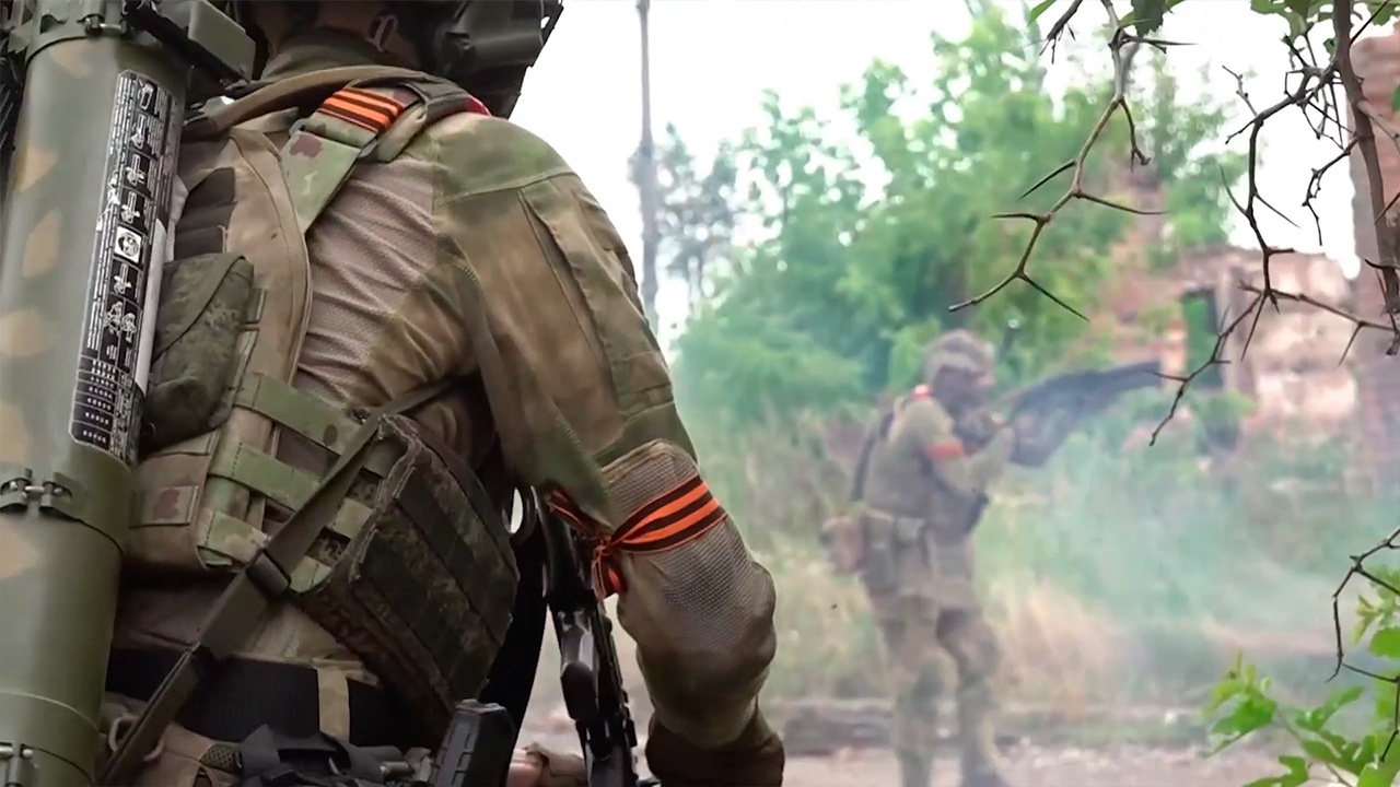 Десантники-огнеметчики поражают укрытия боевиков термобарическими снарядами из реактивных пехотных огнеметов РПО-А «Шмель» и легких пехотных огнеметов (ЛПО). Огнеметчиков прикрывает группа охраны.