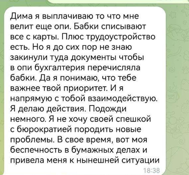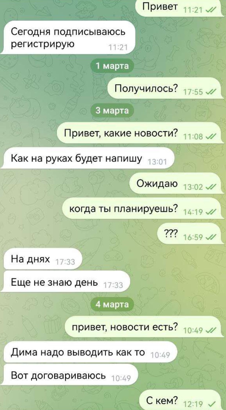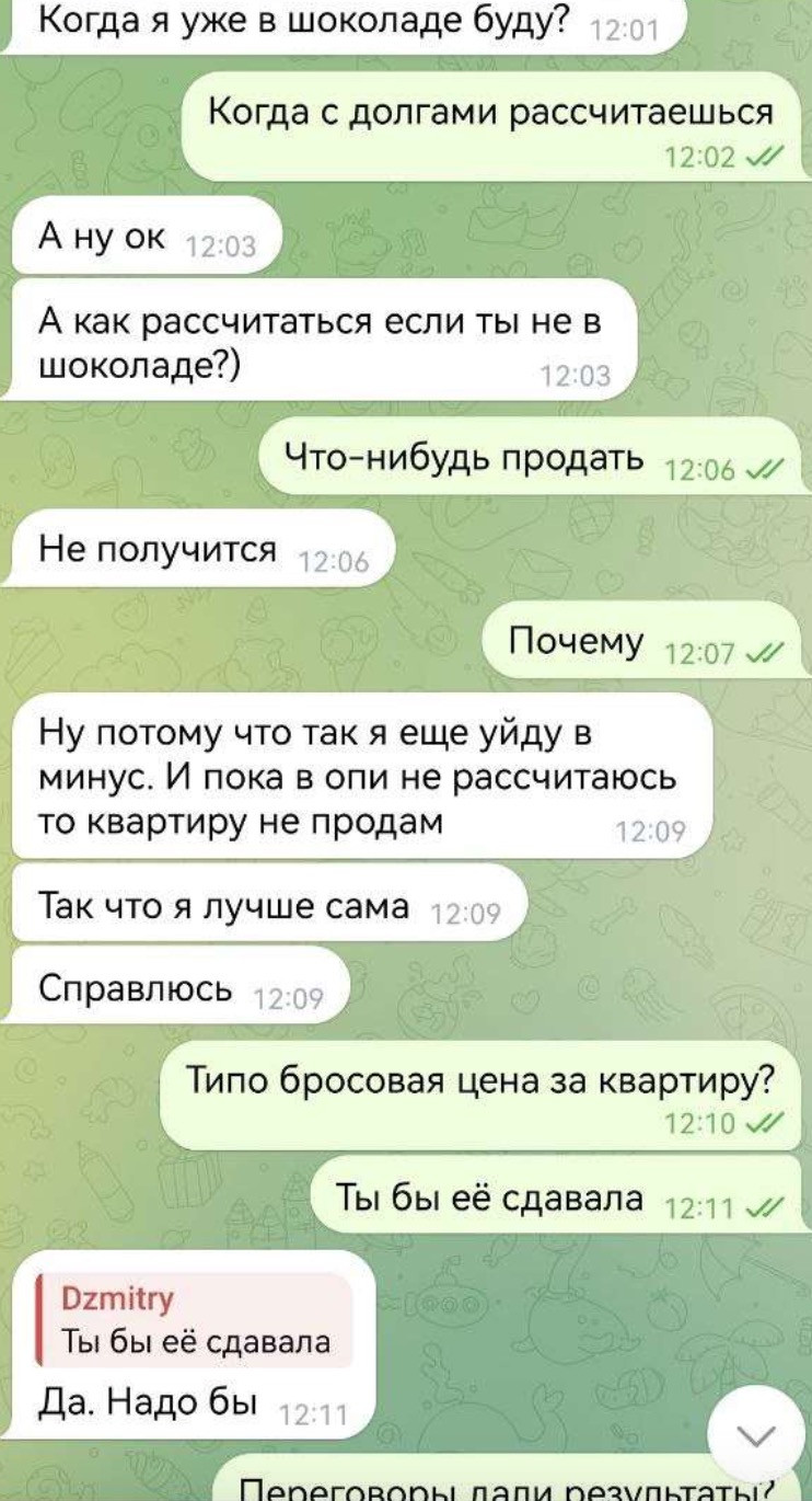 Мы с Дмитрием до сих пор переписываемся, и он знает мою ситуацию. То, что он обратился к вам, — это давление на меня, чтобы я быстрее вернула долг.