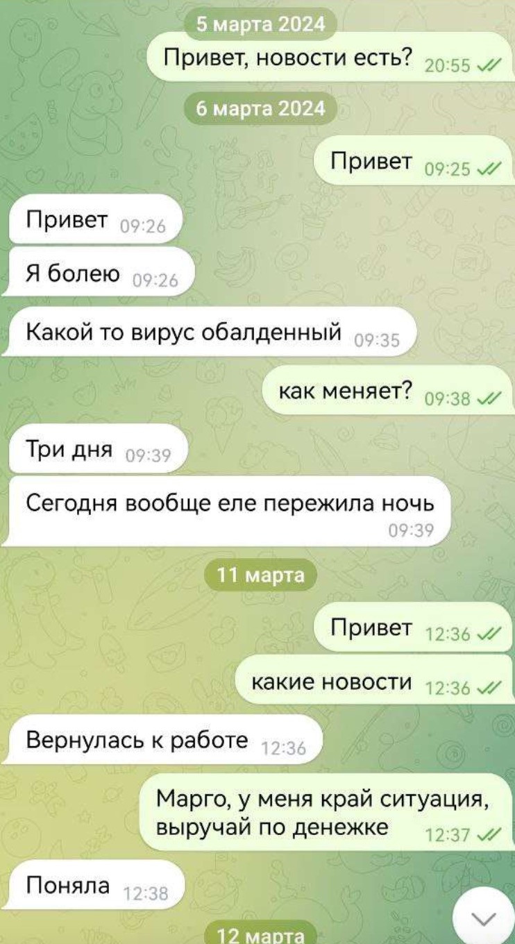 По словам Дмитрия, он хотел начать с небольших вложений — «просто посмотреть, как пойдет». Так, в феврале 2023 года парень передал Маргарите первые $2000. Встречались в кафе: с него деньги — с нее договор займа.