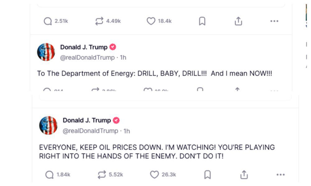 "Все! Держите цены на нефть низкими. Я слежу! Вы играете на руку врагу. Не делайте этого, — написал Трамп в своей сети Truth Social. И заодно дал поручение Минэнерго США, потребовав исполнить его сейчас же: — БУРИ, ДЕТКА, БУРИ!!!"