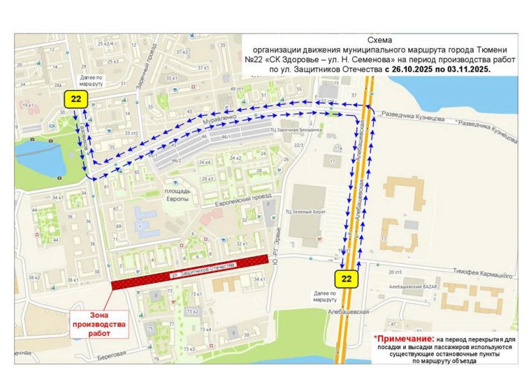 В Тюмени автобусный маршрут № 22 временно изменит схему движения из-за дорожных работ на улице Защитников Отечества. Как сообщили в городской администрации, с 26 октября по 3 ноября транспорт будет курсировать в объезд перекрытого участка в районе пересечения с улицей Газовиков. Все существующие остановочные пункты при этом сохранятся на маршруте объезда.