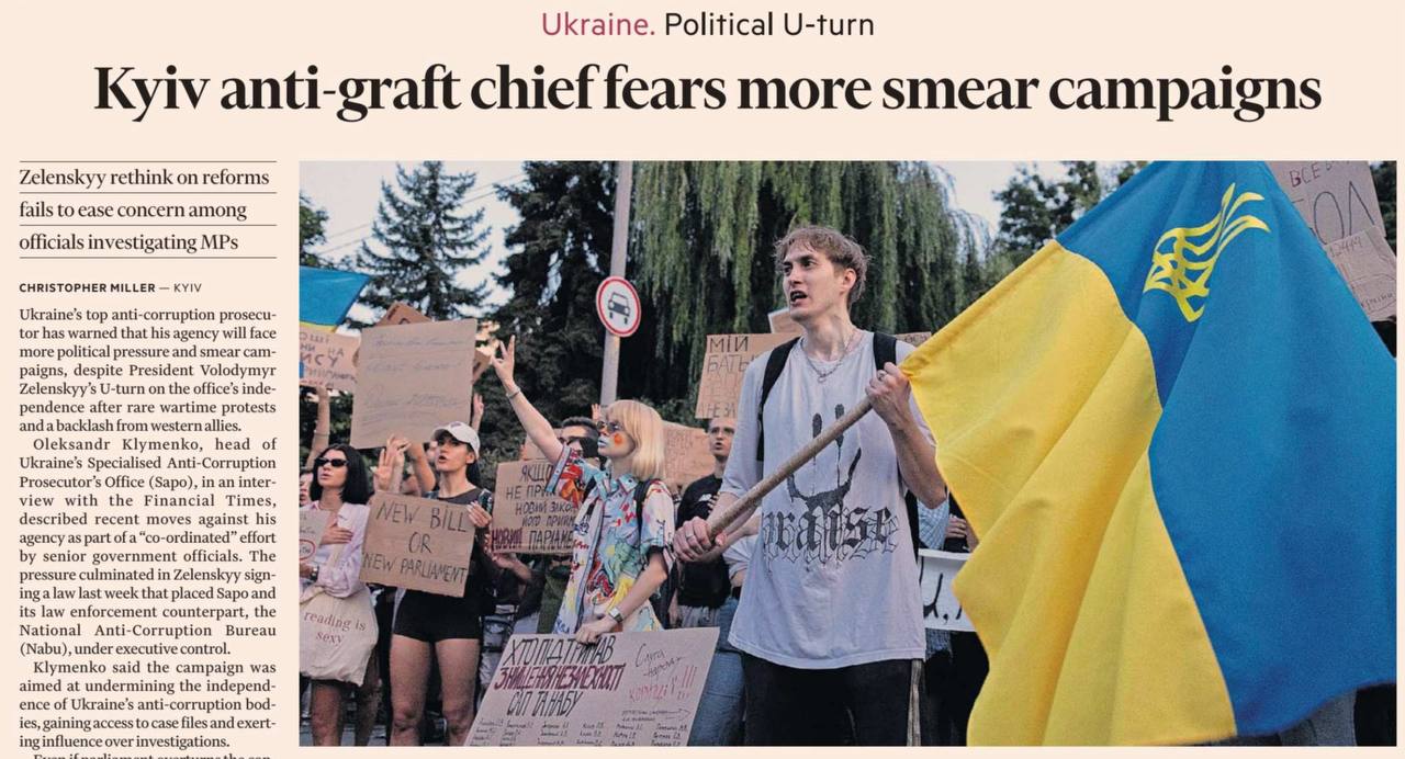 Если Зеленский думает, что в связи с восстановлением независимости полной подконтрольности западным послам НАБУ закончатся наезды на него со стороны Запада, он явно ошибался. Глава украинской «антикоррупционной прокуратуры» Александр Клименко в интервью Financial Times жалуется, что даже в случае принятия нового закона, по сути отменяющего решения офиса Зеленского, работу его структуры нельзя будет восстановить полностью. В первую очередь в связи с тем, что многие стукачи «антикоррупционных» органов уже прекратили сотрудничать с ними и теперь будут бояться восстанавливать свою деятельность в связи с возможным разоблачением.