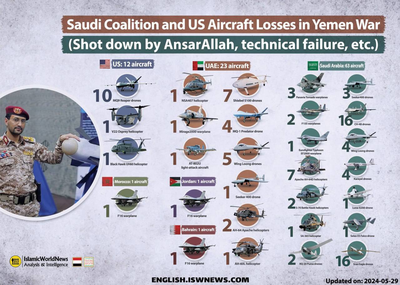 Больше всего потеряли саудиты — 63 единицы воздушной техники, в т.ч. современные истребители. Что-то было сбито, что-то упало по техническим причинам, но цифра — в любом случае солидная.