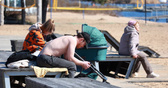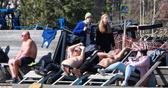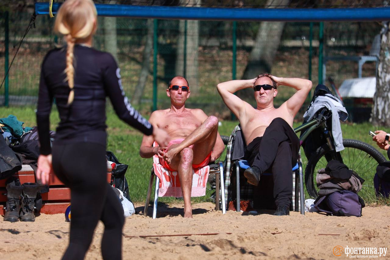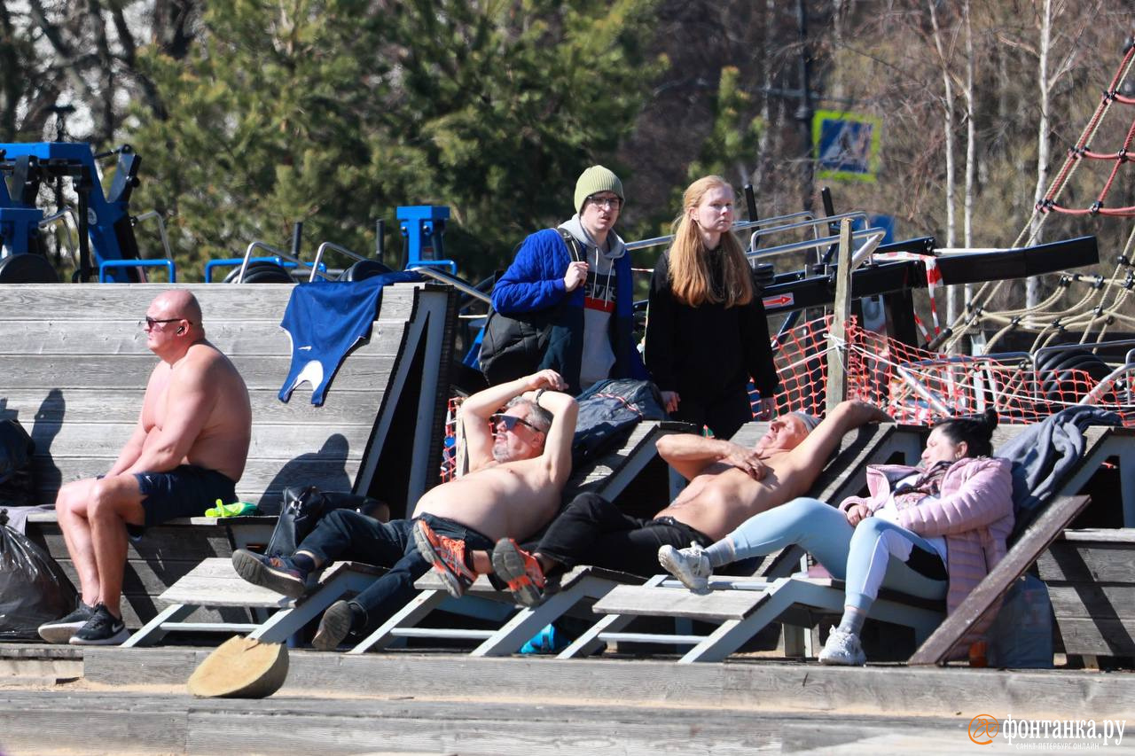 Самые смелые уже разделись и загорают на шезлонгах. В то время как мимо них прохожие идут в шапках и куртках. Сегодня столбик термометра не поднимется выше 13 градусов, однако на солнце припекает уже по-летнему. Горожане ловят момент и готовятся к длинным майским выходным.