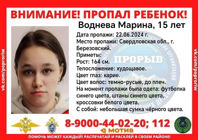 В Свердловской области четвертый день разыскивают 15-летнюю девочку. Марина Воднева пропала в Березовском еще 22 июня.
