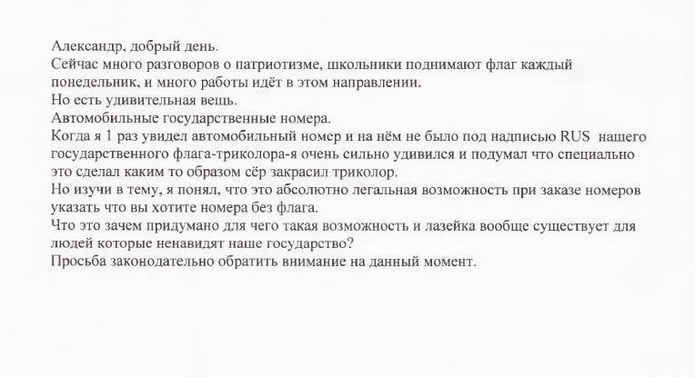 На это обратил внимание депутат Госдумы Александр Хинштейн, который предложил в обязательном порядке установить правило наличия изображения государственного флага РФ на регистрационном знаке транспортных средств. Для чего вообще изначально существует такая лазейка — вопрос. Вероятно, для демонстрации гражданами превратного отношения к символике государства, в котором проживают. Теперь после обращения в ГУОБДД МВД РФ, где отметили, что работа по этому направлению уже ведется, до конца текущего года нанесение триколора станет обязательным по стандартам ГОСТ.