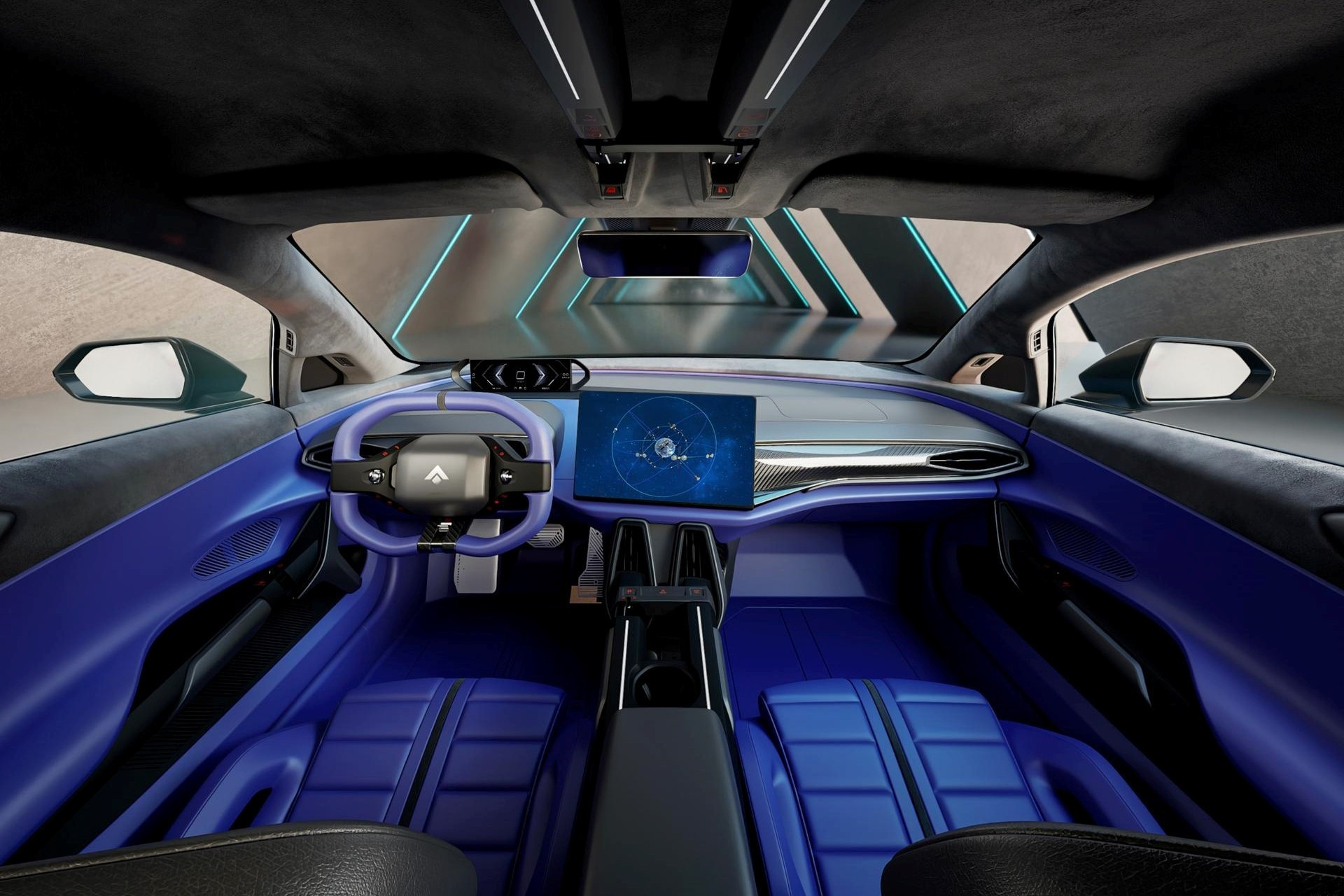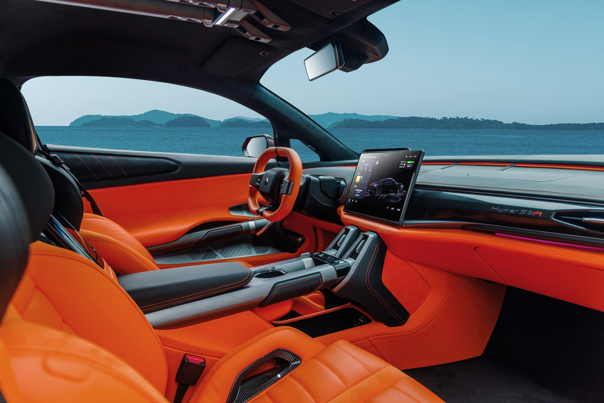Двухместный салон Hyper SSR щедро отделан кожей и имеет довольно оригинальный дизайн центральных воздуховодов, которые являются как бы основанием парящего центрального тоннеля. Размер приборного экрана — 8,88 дюйма, мультимедийного — 14,6 дюйма. Оба кресла оснащены вентиляцией, обогревом и электроприводом регулировок. Для сумок есть небольшой багажник в корме.