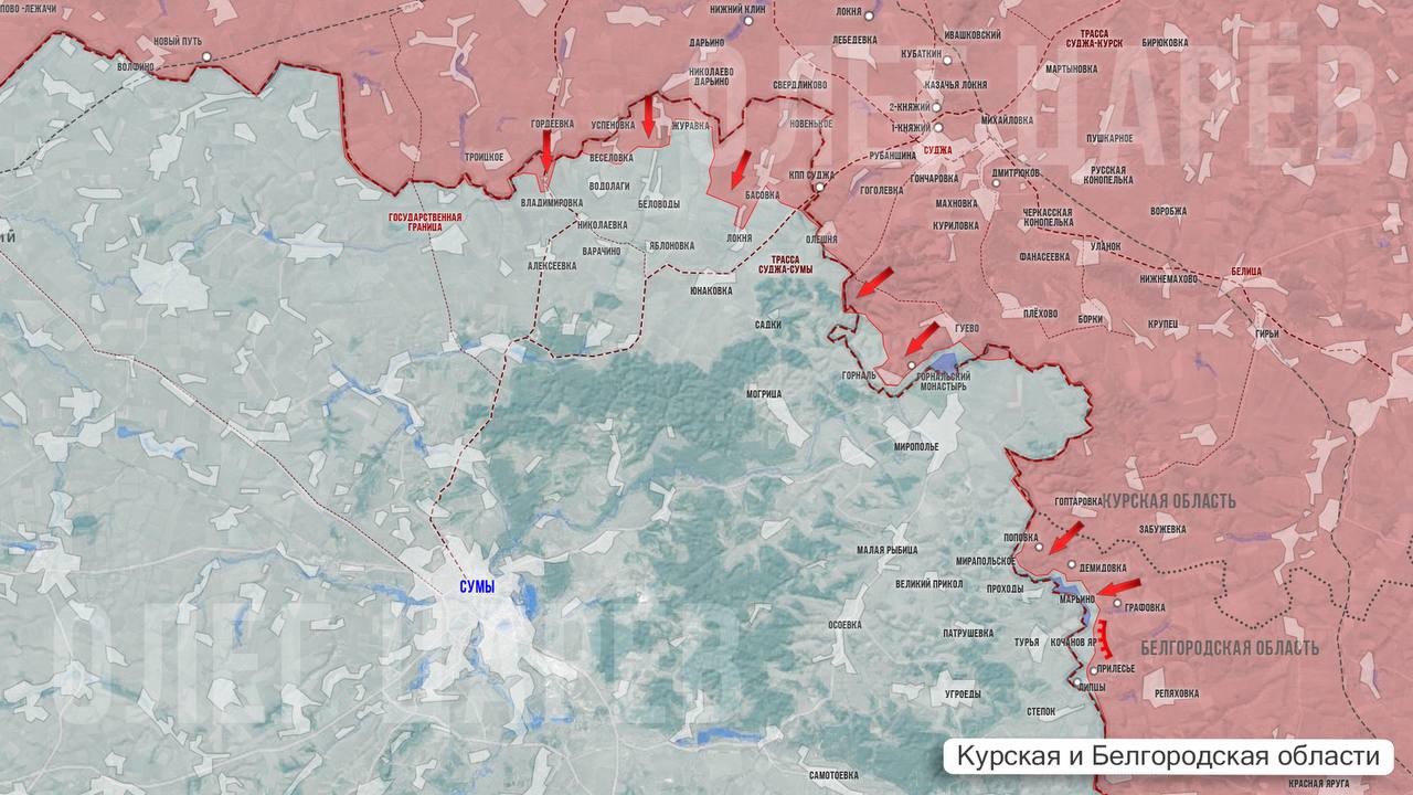 ▪️На территории Сумской области идут бои в районах Беловодья, Журавки, Басовки и Локни. Сообщают о существенном продвижении ВС РФ в районе Журавки, а также о том, что наши бойцы зашли в северную часть села Беловоды и закрепляются. В Басовке идут встречные бои, ВСУ контратакуют на квадроциклах.