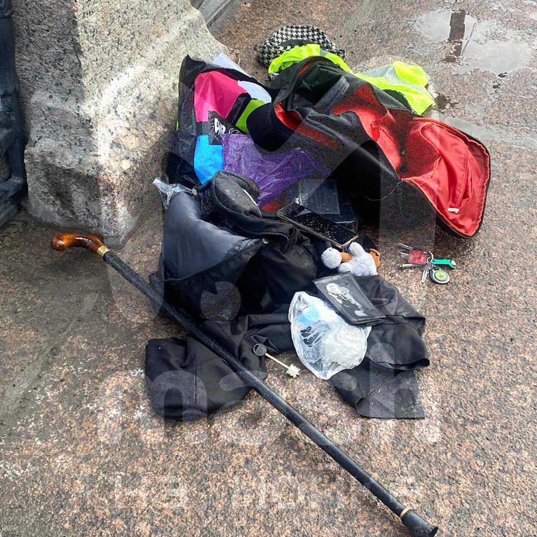 Кадры крупным планом из салона рухнувшего в Мойку автобуса — у него разбиты почти все стёкла, внутри остались некоторые вещи пассажиров. Трость, рюкзак, телефон и ключи сложены на набережной.