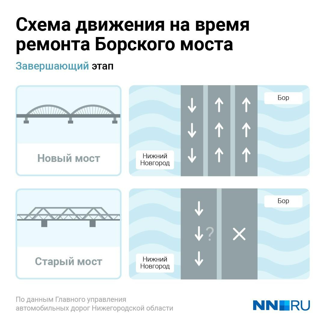 С ноября 2024 года начнется завершающий этап ремонта. Он должен продлиться год. После того как проведут основные работы, власти рассмотрят возможность открытия движения по отремонтированной половине дороги на старом мосту. При этом на новой переправе движение будет организовано по двум полосам на выезд из Нижнего и одной на въезд. Закончить ремонт моста должны в конце 2025 года.