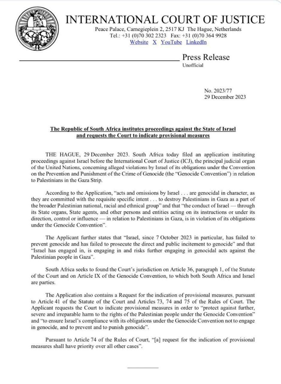 📝 «Сегодня Южная Африка подала заявление о возбуждении против Израиля разбирательства в Международном Суде (МС), главном судебном органе Организации Объединенных Наций, в связи с предполагаемыми нарушениями Израилем своих обязательств по Конвенции о Предупреждение преступления геноцида и наказание за него («Конвенция о геноциде») в отношении палестинцев в секторе Газа», – говорится в пресс-релизе.