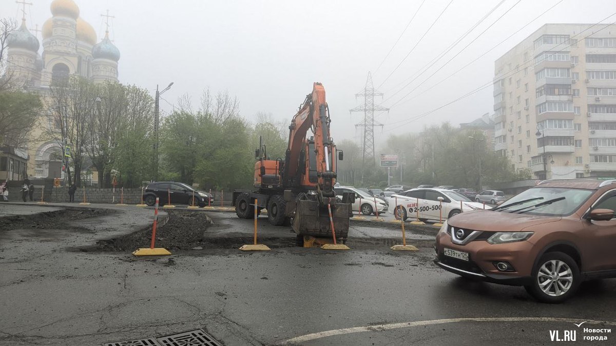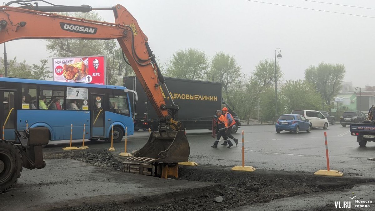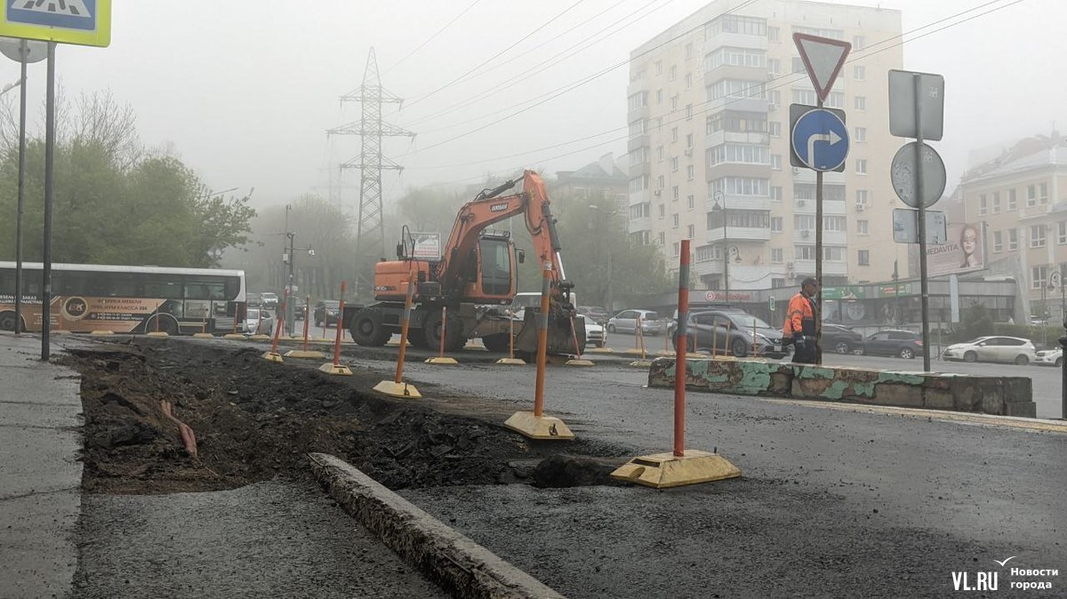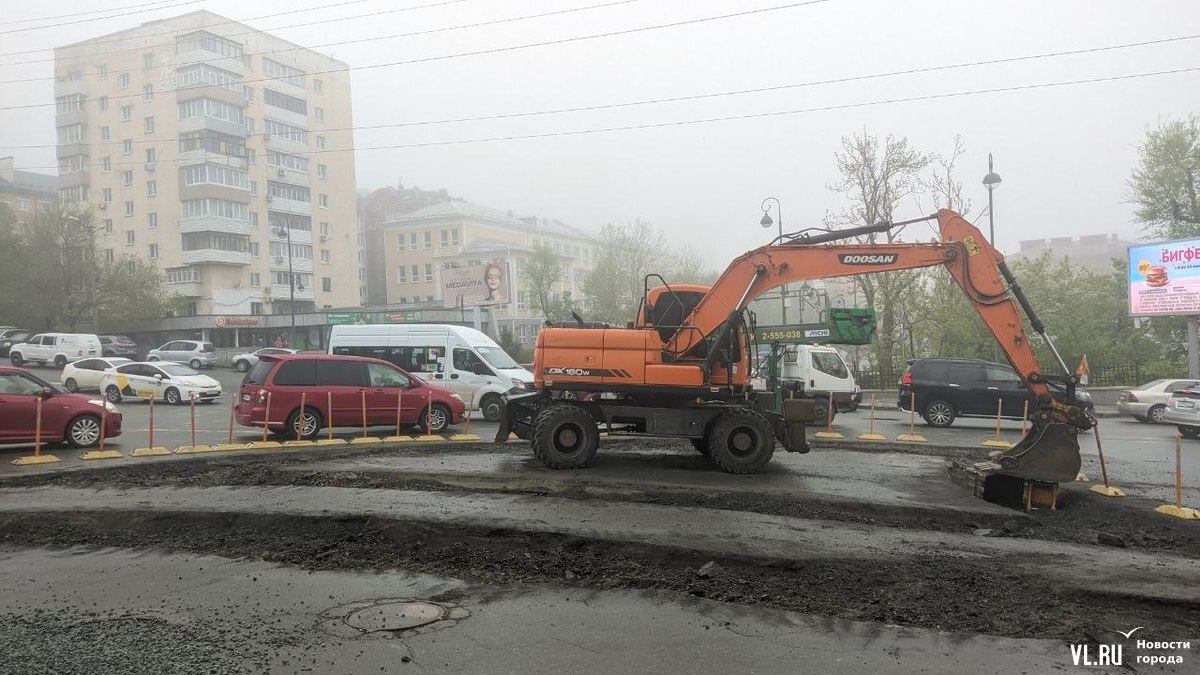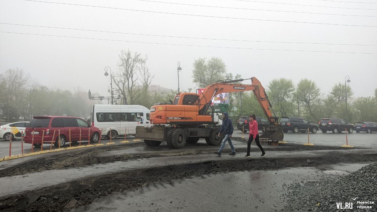 Утром в понедельник, 15 мая, на участке ведутся интенсивные дорожные работы – трудятся несколько рабочих и экскаватор. Сейчас под будущий тротуар раскопан асфальт вдоль крыльца Учебно-научного музея ДВФУ (Океанский проспект, 37) и на треугольном участке, который раньше полностью обозначали делиниаторы. Большая часть самих делиниаторов пока ещё осталась на месте – убран один ряд со стороны музея.