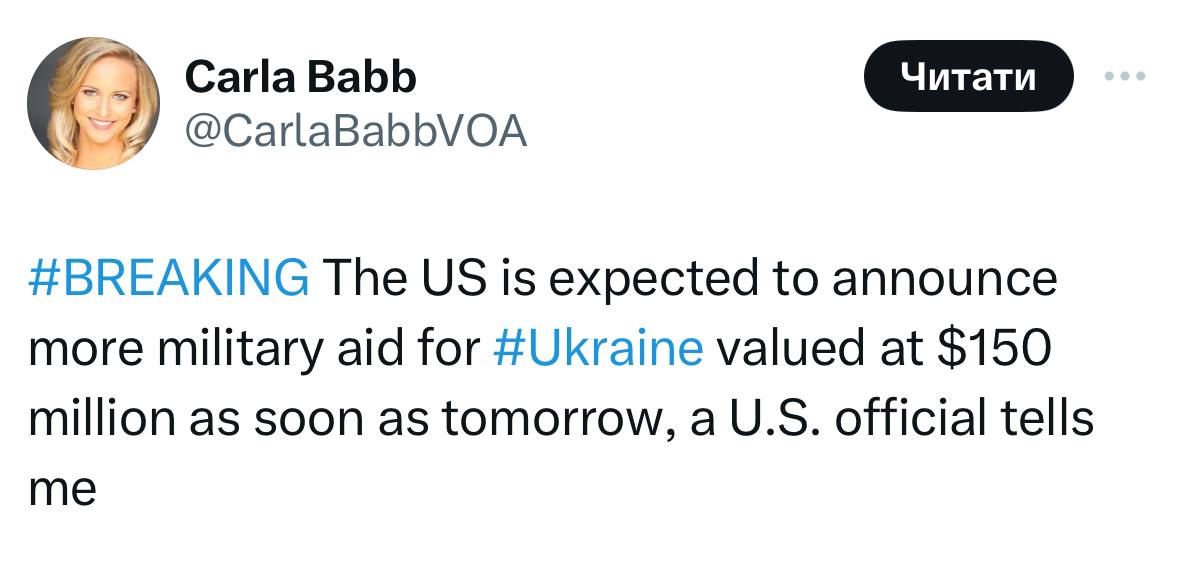США во вторник объявят очередной пакет военной помощи Украине на 150 млн долларов.
