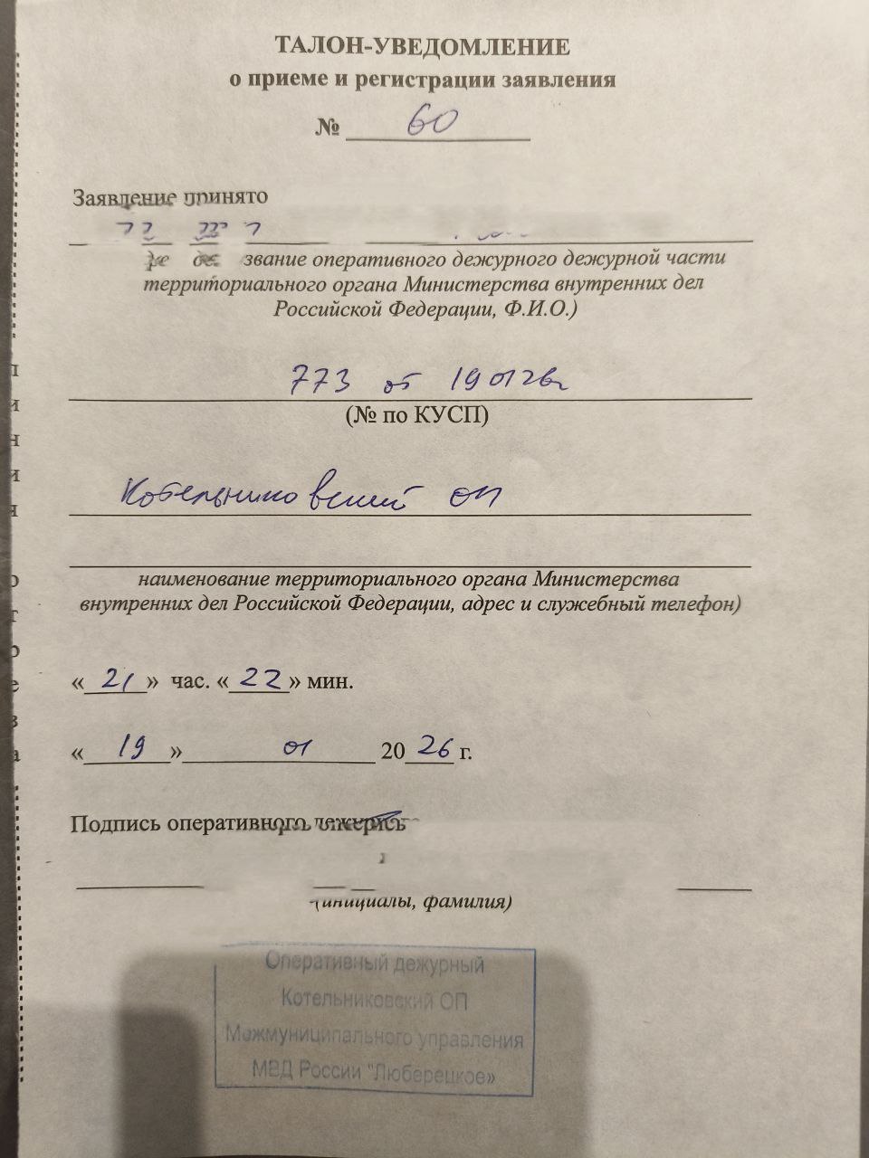 В полицию позвонили сказали что не смогут приехать на вызов из за большого количества других более важных звонков и предложили приехать в отделение как у нас появится время 24/7. Заявление написано 19.01.2026 но без результата.